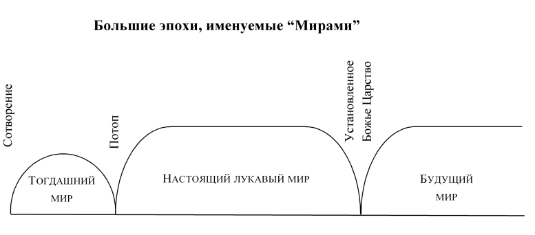 Эти три большие эпохи представляют три отдельные проявления божественного провидения. Первая из них – от сотворения до [67] потопа – находилась под надзором ангелов. Петр называет ее “тогдашним миром” (2 Петр. 3: 6). Вторая большая эпоха – от потопа до установления Божьего Царства – находится под ограниченным контролем сатаны, “князя мира сего”, и потому названа “настоящим лукавым веком” (Гал. 1: 4; 2 Петр. 3: 7). Третьей эпохой должны быть “веки веков” (Ис. 45: 17) под божественным руководством (Божьим Царством), потому она названа “будущей вселенной”, в которой “обитает правда” (Евр. 2: 5; 2 Петр. 3: 13). Первый из этих периодов, или “веков”, бывший под надзором ангелов, принес неудачу. Второй, под властью сатаны, узурпатора, действительно оказался “лукавым веком”. Но третий будет эрой справедливости и благословения для всех народов земли.