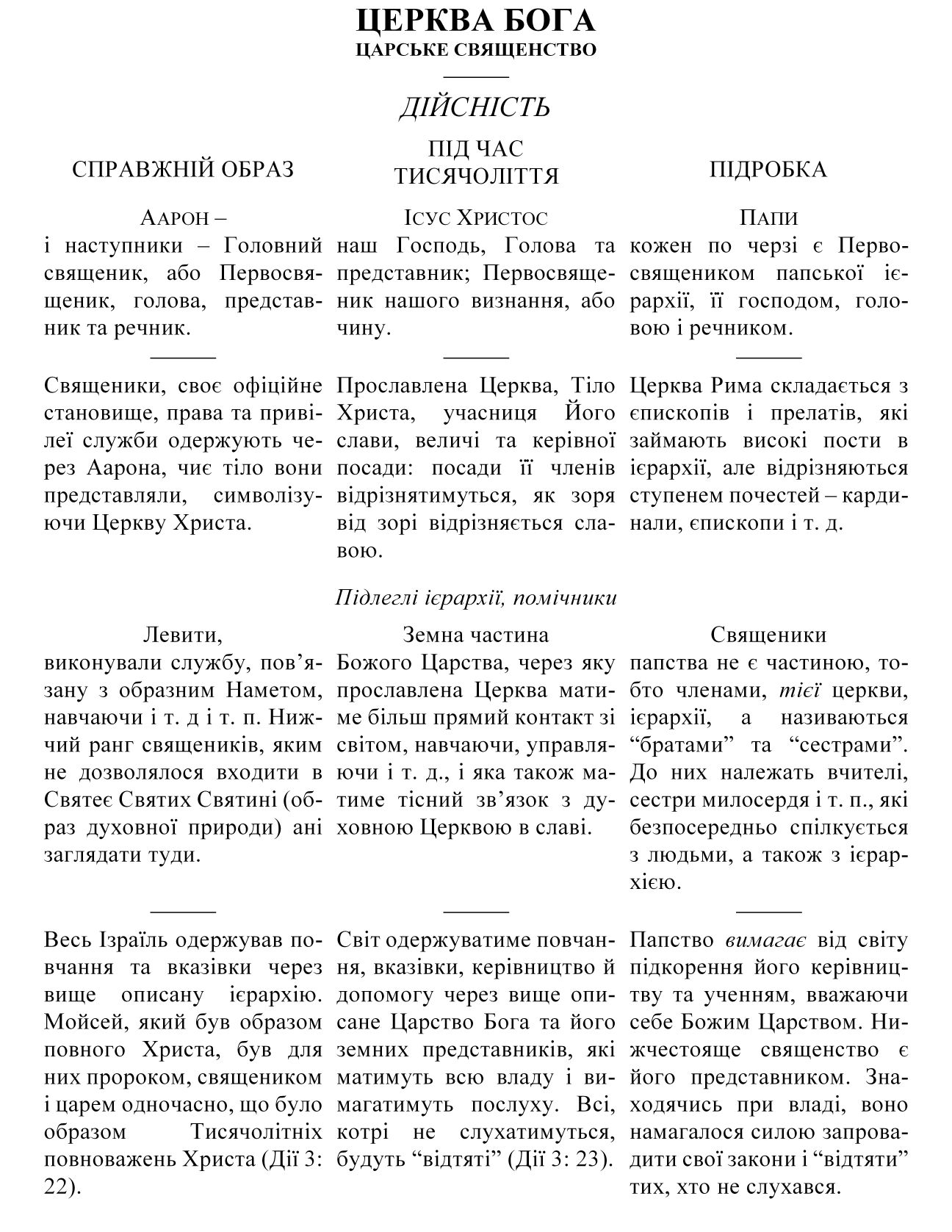 Безсумнівно, багато хто зі здивуванням помітить, що в нашому дослідженні цієї теми ми в цілому уникали згадок про злодійства та жахливу аморальність пап та інших чиновників, а також про темні діла “доцільності”, які робили єзуїти та інші таємні ордени, виконуючи різного роду розшукні роботи для папства. Ми свідомо обминули їх не тому, що вони неправдиві, бо навіть католицькі письменники визнають багато з них, а тому, що послідовність наших доказів не вимагає цих фактів. Ми показали, що папська ієрархія (навіть якщо б вона складалася з найбільш моральних та справедливих людей – що, як свідчить вся історія, не відповідає дійсності)є Чоловіком Гріха, Антихристом, спотворенням і підробкою Христового Тисячолітнього Царства, спритно влаштованою так, щоб обманювати.