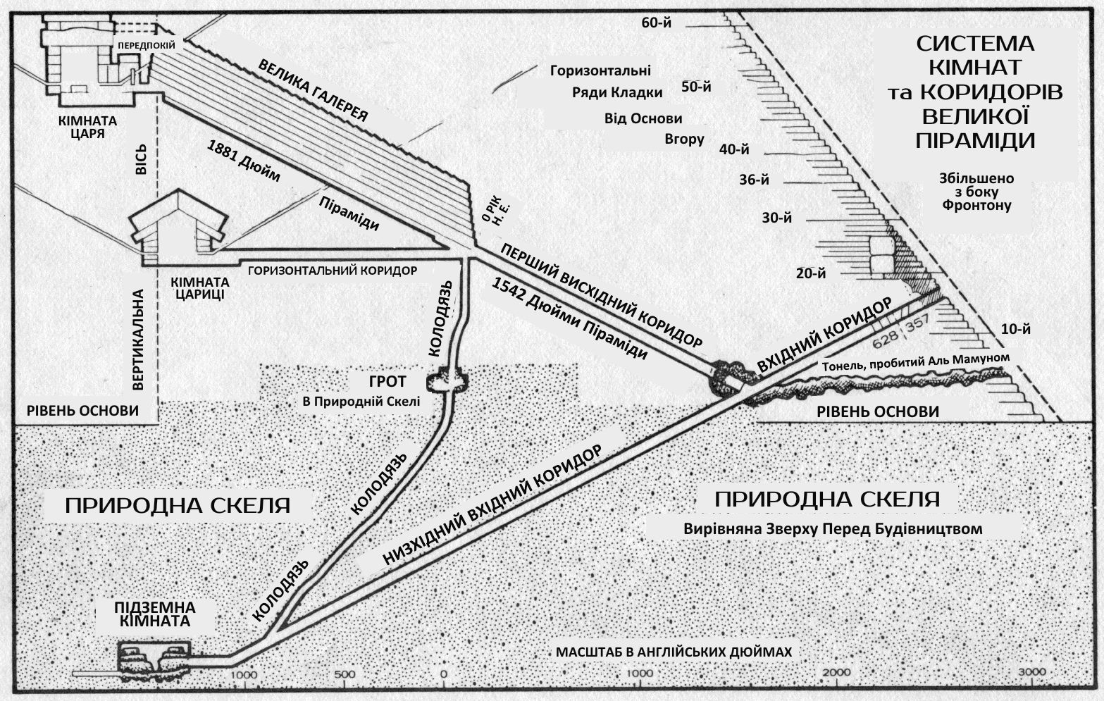 Перший важливий крок з метою доказати, що Велика Піраміда містить у собі наукові дані, зробив м-р Джон Тейлор з Англії у 1859 році. З того часу багато здібних розумів приділили свою увагу дальшому вивченню свідоцтва цього чудового “Свідка” – [320] особливо, коли її відвідав проф. Піацці Сміт, королівський астроном Шотландії, і протягом декількох місяців докладно вивчав її особливості, представивши світу дивовижні факти її будови та розмірів, а також зроблені ним висновки. За ті дані, які використані в цьому розділі, ми великою мірою зобов’язані саме його старанній науковій праці “Наш спадок у Великій Піраміді”. Наші ілюстрації – це копії декількох з двадцяти п’яти малюнків, якими прикрашене останнє видання цієї праці.