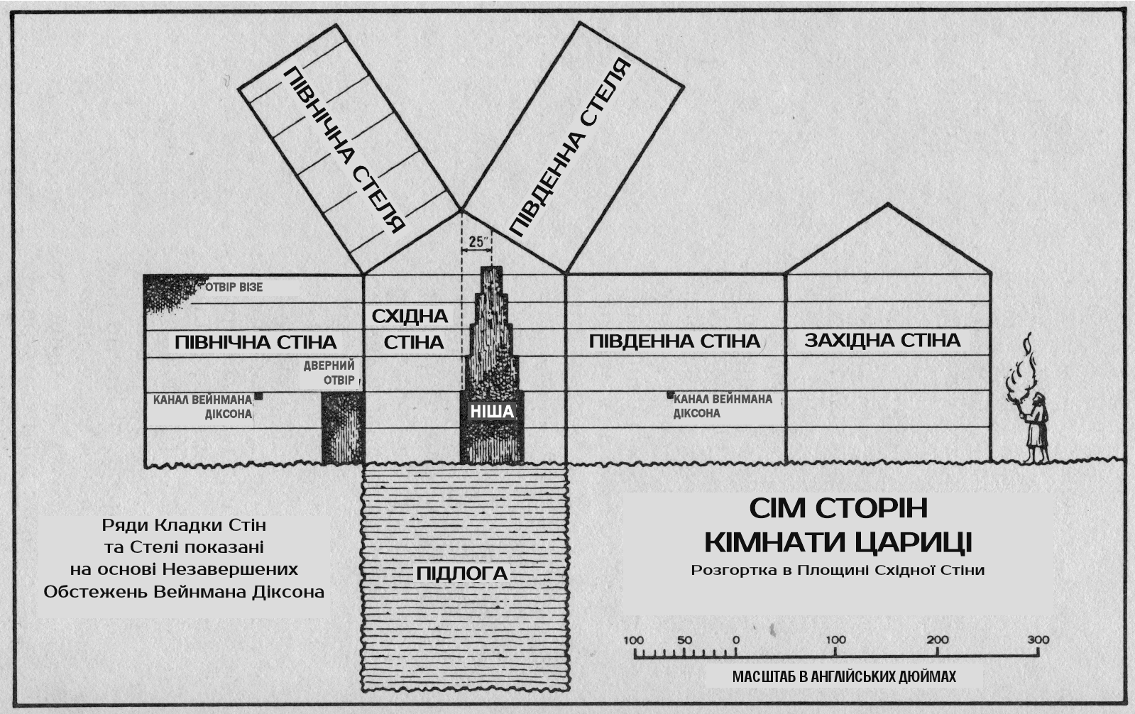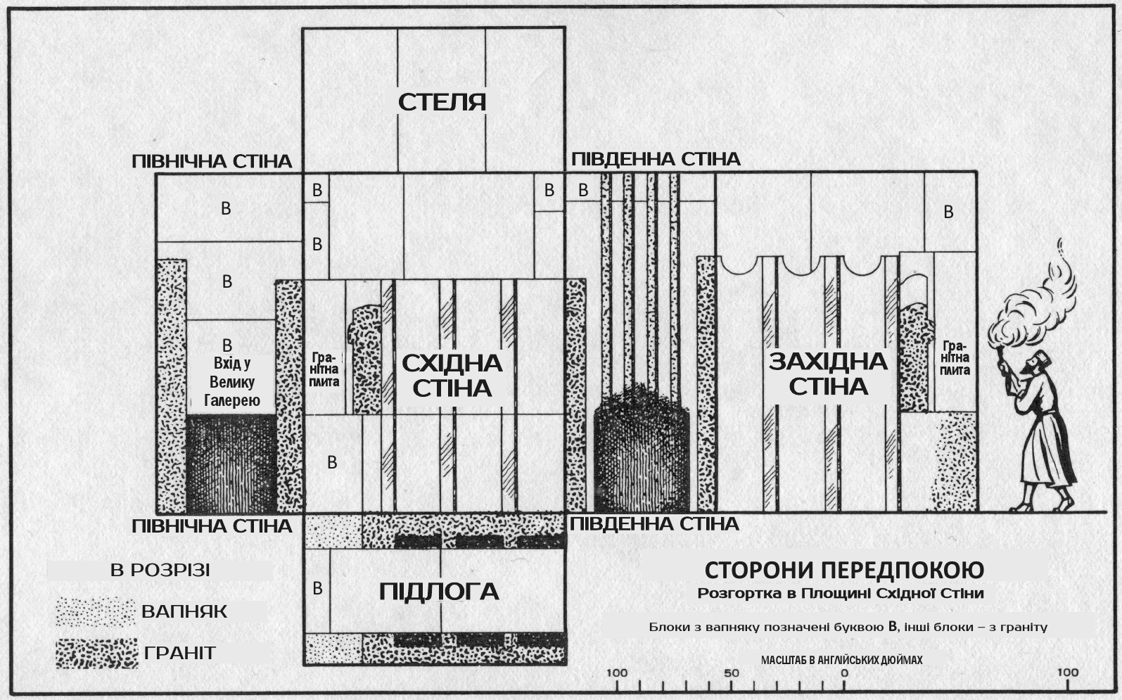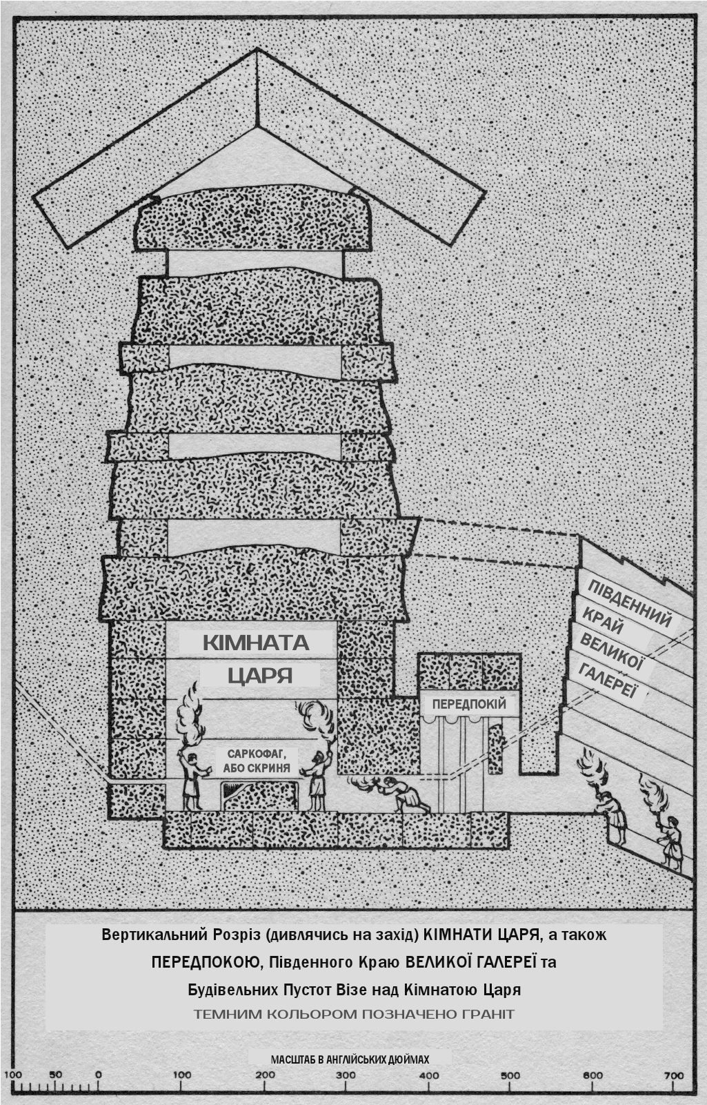 У верхньому, тобто південному, кінці “Великої Галереї” лінія підлоги “Передпокою” і “Кімнати Царя” переходить у “Велику Галерею”, утворюючи раптовий бар’єр, або високий поріг, у її верхньому кінці. Цей поріг виступає від південної стіни на шістдесят один дюйм. Південна кінцева стіна “Великої Галереї” має також особливість: вона не вертикальна, а нахиляється [336] на північ – уверху на 20 дюймів*, – а в самому верху є отвір, перехід, що з’єднує її з так званими “Будівельними Кімнатами” над “Кімнатою Царя”.