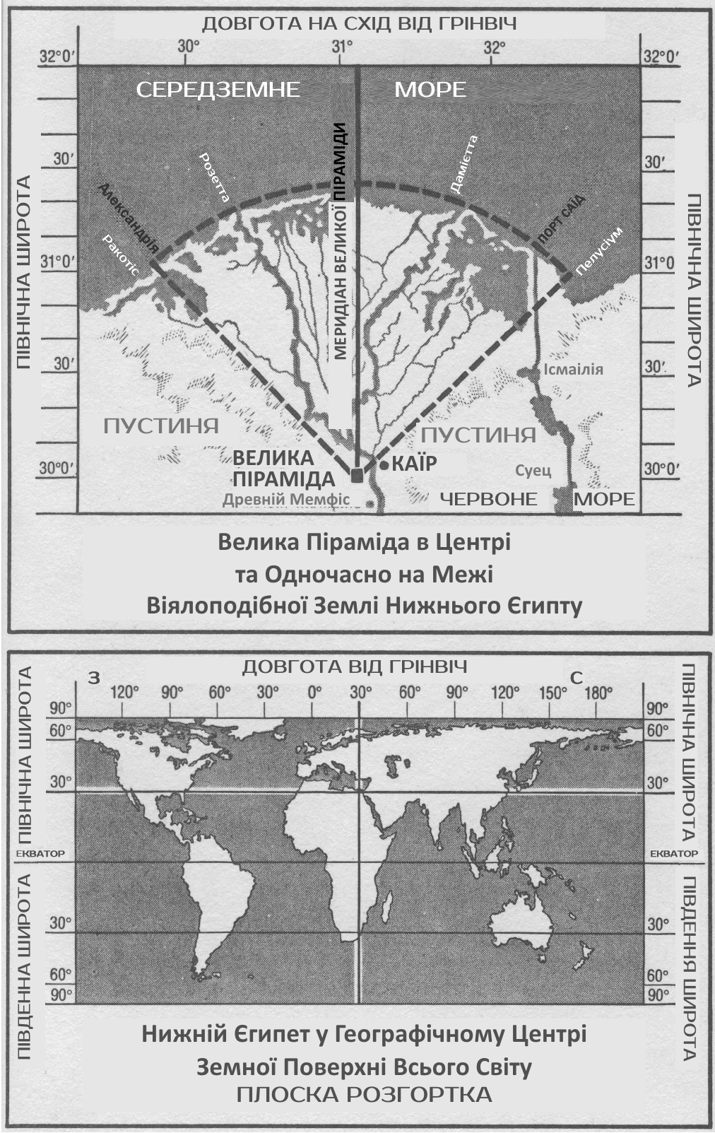 Лінія, проведена від вхідного коридору прямо на північ, пересікла би найбільш північну точку єгипетського узбережжя, а лінії, що є продовженням північно-східної та північно-західної діагоналей будівлі, оточили би дельту з двох сторін, таким чином охоплюючи віялоподібної форми країну Нижнього Єгипту (див. ілюстрацію, стор. 323). Збудована на найбільш північному виступі скелі Гіза і піднята над цією ділянкою, тобто відкрита для всієї віялоподібної землі Нижнього Єгипту, Велика Піраміда, правду кажучи, дійсно стоїть на самій його границі, як і в його умовнім центрі, описаному пророком Ісаєю: “Того дня серед краю [326] єгипетського буде жертівник Господу, і стовп [піраміда] при границі його Господеві. І він буде в єгипетськім краї ознакою й свідком для Господа Саваота”. Існує ще один факт, гідний уваги, а саме: Велика Піраміда розташована в географічному центрі земної поверхні світу – включаючи Північну та Південну Америку, які після визначення місця й будови Великої Піраміди ще століттями залишались невідомими.