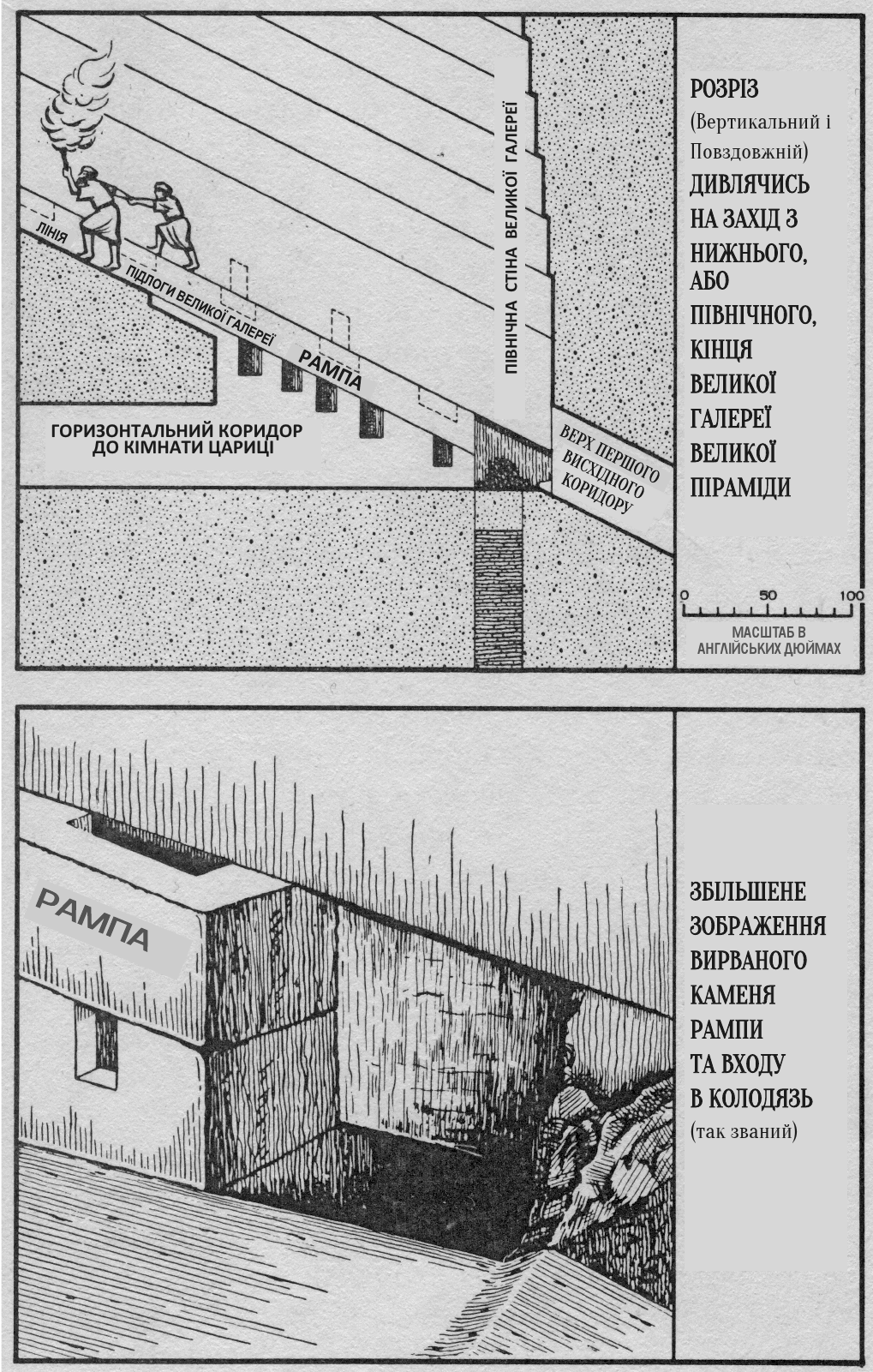 [348] “Це надзвичайно величний виріб, що не поступається дивовижністю мистецтва, ані багатством матеріалів найбільш розкішним та величним будівлям... Ця галерея, чи коридор (чи як би ще я її не назвав) збудована з білого полірованого мармуру (вапняку), надзвичайно рівно розпиляного на великі прямокутники або плити. З цього матеріалу викладена підлога, а також стеля і бічні стіни; шпарування цих з’єднань настільки щільне, що їх важко помітити навіть прискіпливим оком. Але тим, що додає вишуканості цілій будівлі, хоч і робить коридор дуже ковзким й важко прохідним, є узвіз і його крутизна... В укладці та розміщенні мармуру (вапняку) обох бокових стін є, на мій погляд, одна дуже витончена архітектурна деталь, а саме: всі ряди, тобто рівні, яких лише сім (настільки великі ці камені), укладені і нависають один над одним приблизно на три дюйми, тобто низ верхнього шару нависає над верхом попереднього, і так решту шарів по порядку донизу”.